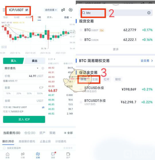 2、点击左上角币对,在搜索框输入币种,选择相应币对的合约类型和保证金类型。