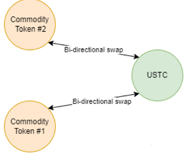 (4)好的,现在项目方交了保证金,部署了个项目,发了个初始总量为0的CT,我们为了玩这个项目,用LUNC去换了CT,可以玩项目了,但关USTC啥事?作者说:不同的CT之间想进行兑换,必须先换成USTC,就和下面的图一样:CT1先换成USTC才能换成CT2,反之亦然。