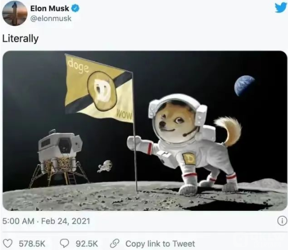 2021年2月,即将成为世界首富的马斯克连发数条推特宣传狗狗币,称“我们不需要成为亿万富翁就能拥有狗狗币”、“狗狗币是人民的虚拟货币”,开始把狗狗币介绍给币圈外的人,大量投机客也开始涌入。