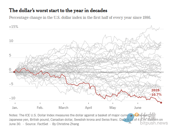 今年以来,美元的避险属性正面临前所未有的挑战。据 FactSet 数据,2025 上半年,美元指数(DXY)累计跌超 10%,创 1973 年以来最疲软上半年表现。以往在金融市场波动期会走强的美元,如今却与长期美债收益率一同走高,呈现出新兴市场才有的反常特征。